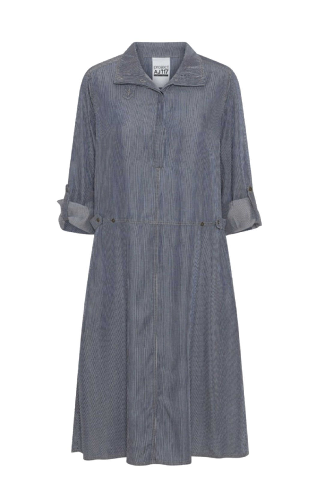 Mellemlang blød jeansagtig kjole fra AJ.117 Project. Lange ærmer med manchet, som kan foldes op og hægtes fast med strop. Skjult stolpelukning foran foroven. Kan lukkes med høj hals. Strop som markerer taljen.
