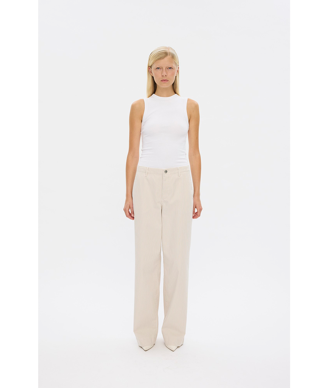 EricaFV har et afslappet og rent udseende og sidder på en opbygget linning med bæltestropper og en lynlås med knaplukning. De er skåret lige i en silhuet med vide ben og har subtile detaljer i form af syninger og påsatte baglommer.