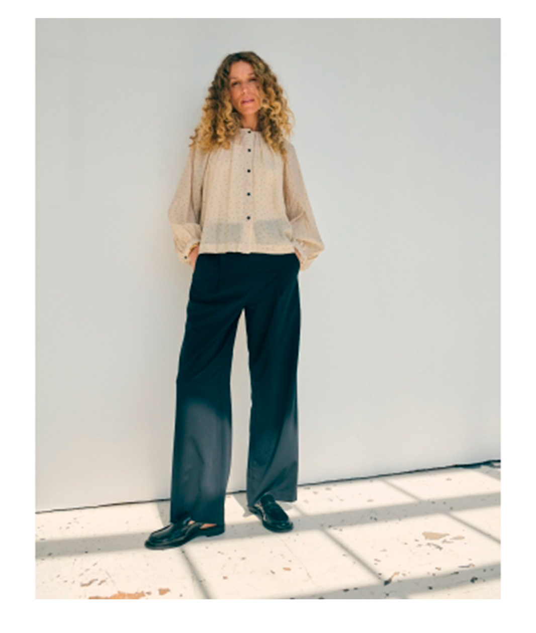 Trine Pants er klassiske bukser med høj talje og brede ben, der kombinerer et tidløst snit med et moderne udtryk. Pressefolder foran, bæltestropper og en sideslukning skaber et rent og elegant look, der er let at style.Brug dem alene med en enkel top for et afslappet hverdagslook, eller sæt dem sammen med Trine Blazer for et fuldendt, skræddersyet sæt, der emmer af ro og styrke.