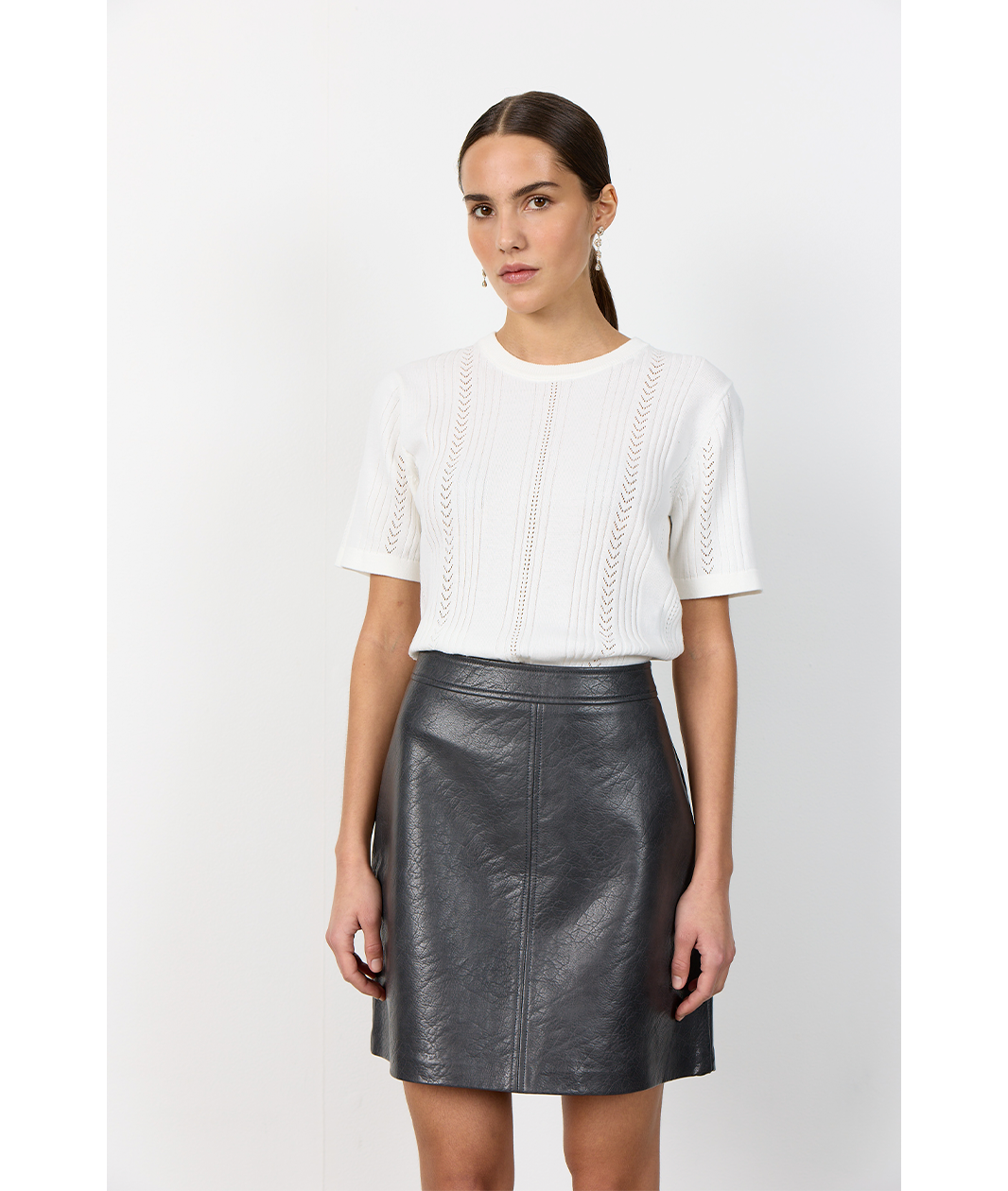 LR-PRIYA 1 er en klassisk t-shirt fremstillet af 100 % økologisk bomuld. Dette elegante design har korte ærmer og et delikat strikmønster i hele stoffet. Sæt den sammen med skræddersyede bukser eller en blyantnederdel for et cool og sofistikeret look.