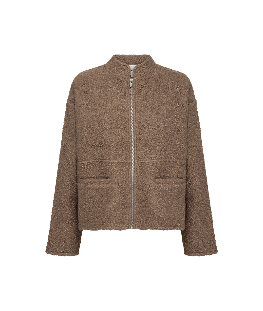 Smart teddy jakke fra Leveté Room. Jakken går en smule op i halsen og lukkes med en lynlås. Derudover har den stiklommer på fronten og lange ærmer med en lille slids forneden.