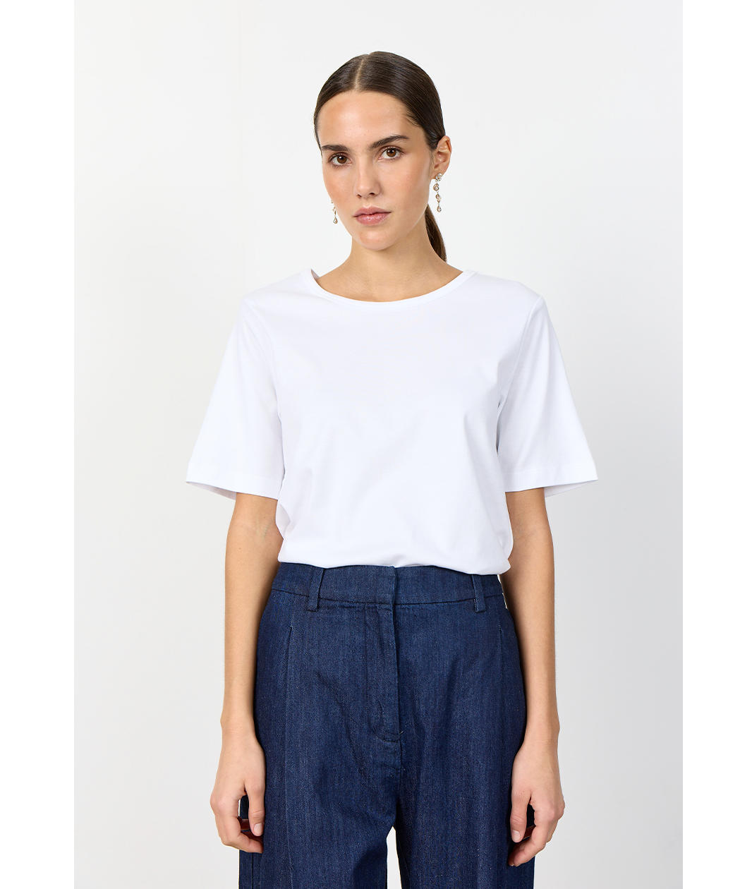 LR-PALOMA 1 er en T-shirt fremstillet af 100 % økologisk bomuld. Den har en klassisk rund halsudskæring og en lige kant forneden, som giver en elegant og behagelig pasform. Sæt den sammen med dine yndlingsjeans eller en statement-jakke for et cool look.