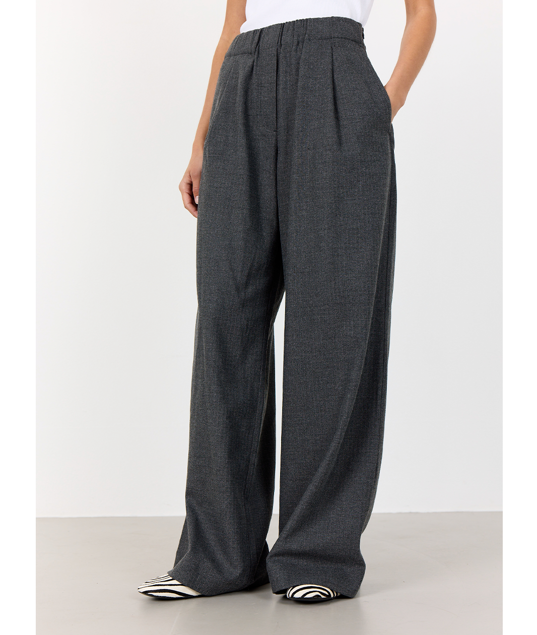 Bukserne har læg, elastik i taljen og vidde i benene. Sæt dem sammen med en tætsiddende top og ankelstøvler for et moderne look.