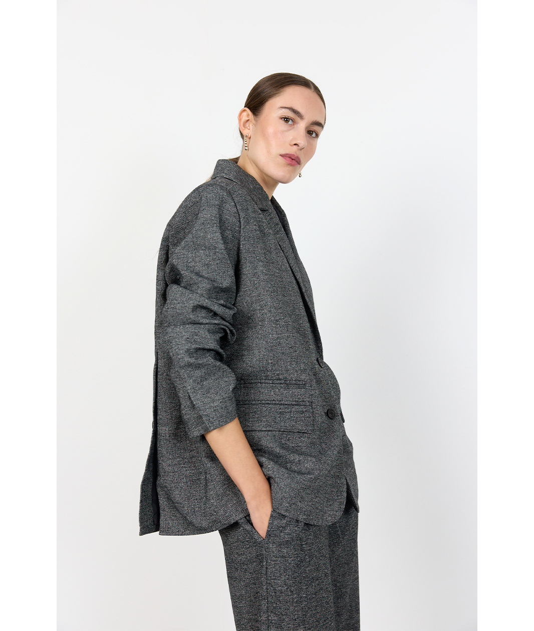 LR-OTIA 1 er en blazer, fremstillet af 78% polyester, 20% genbrugsuld og 2% elastan. Den har klassisk revers, lukning med to knapper og et struktureret stof. Sæt den sammen med skræddersyede bukser for et elegant look eller jeans for et mere afslappet look.