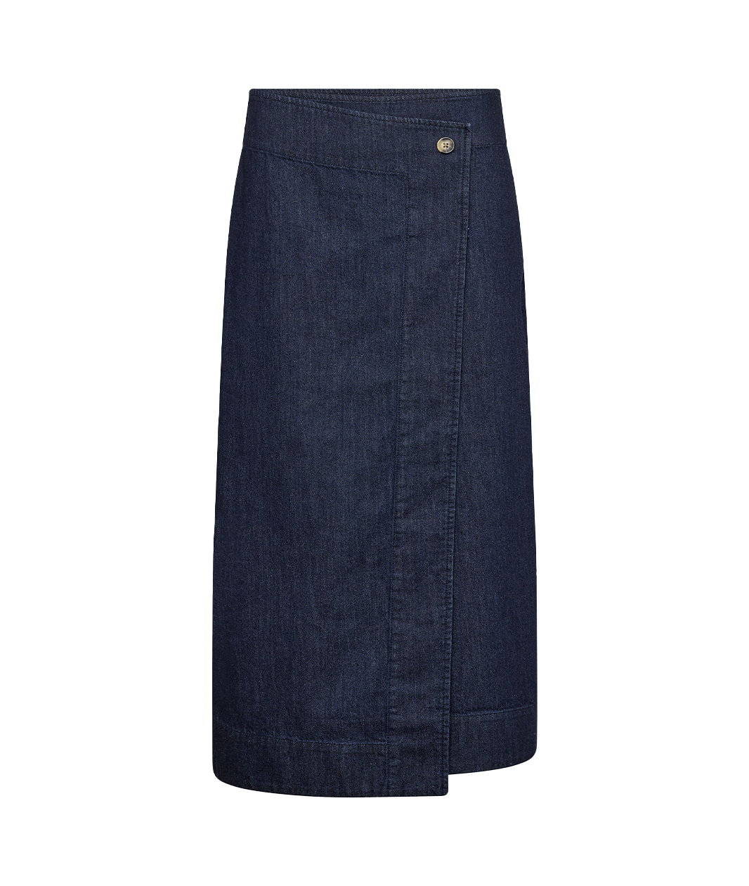 Levete Pietta 3 nederdel darkblueLR-Inez 3 er en denim-lignende nederdel, der hovedsageligt er fremstillet af økologisk bomuld. Nederdelen har et wrap-over-look foran, som lukkes med en knap. Som et fint touch er den samtidig detaljeret med kontrastsyninger. Style den med et par støvler og en tætsiddende bluse til hverdag.e