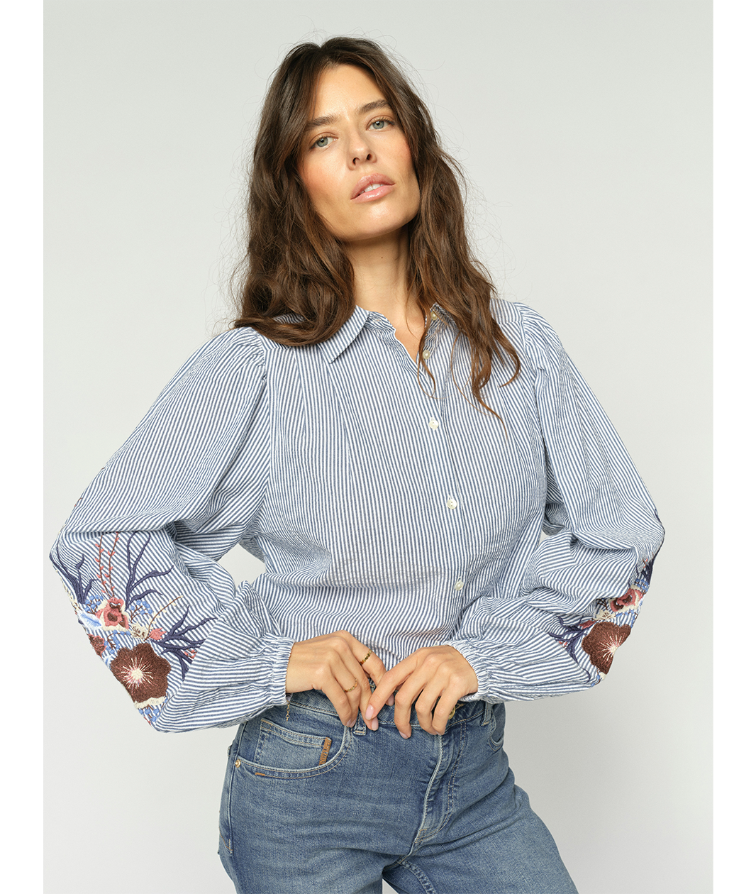 En klassisk bomuldsskjorte med smukt broderi på ærmerne, der tilfører et feminint twist. Den er designet i en tidløs silhuet med knaplukning og et blødt materiale, der kombinerer struktur med komfort – perfekt til både et elegant og afslappet look.