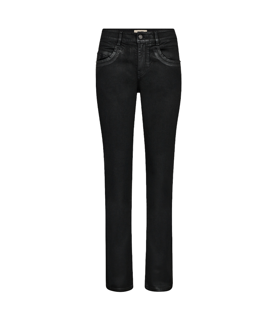 Mos Mosh Naomi coated jeans blackDisse bukser giver hverdagens påklædning et strejf af stil. De er designet i en flatterende slim fit med en mellemhøj talje og er fremstillet af et belagt stof, der giver en cool effekt – bløde at røre ved, men samtidig fulde af attitude. Med detaljerede tone-i-tone syninger og diskret glans er de nemme at style op eller ned. Kombiner dem med en blød strik eller en statement-bluse – og vær ikke bange for at tilføje hæle til dine planer efter mørkets frembrud.