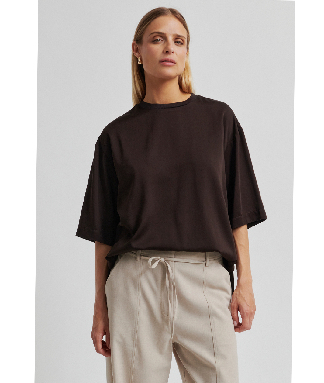 Second Female Samanta ss blouseSecond Female kortærmet silkebluse. Blusen er fremstillet i en silkeblød, draperet viskose-tencelblanding. Rund hals i rib, lave skuldre og korte ærmer. Slids i siden. Løs pasform.